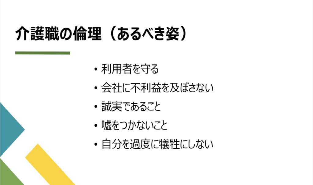 ・ホームヘルパーとしてあるべき姿の判断基準が訪問介護における職業倫理となります。行動や言動を意識し、ヘルパーがあるべき姿として