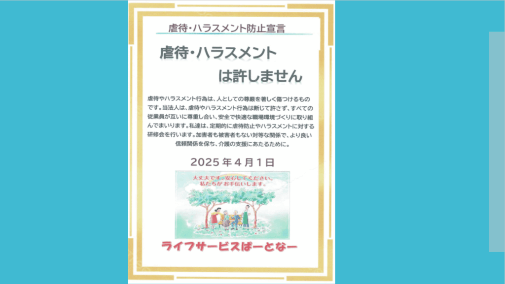 事業所の方針・・・介護現場を含む職員全体のハラスメントについて組織的に取り組み、職員の皆様の心身の安全確保と働きやすく、安心してやりがいを持ち、サービスが提供できる環境つくりを目指します。
