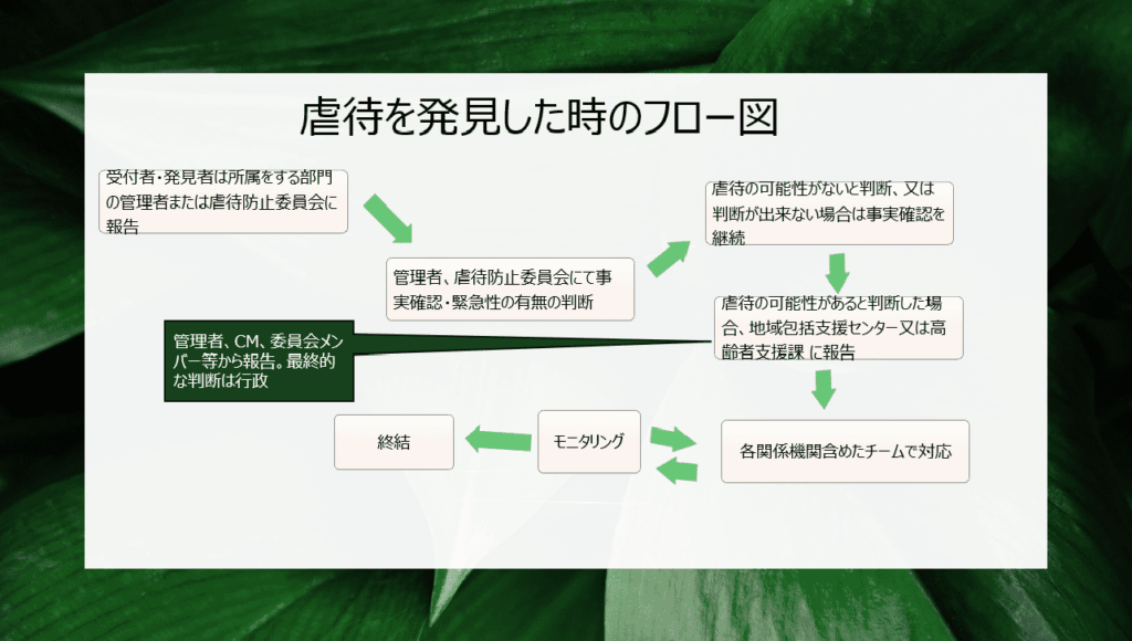 虐待に気が付いたら・・・尊厳を護る役割を果たすために、隠さず知らせていく。予め、虐待が起こった時の組織対応を決めておく。組織としての背景・要因をつかみ、再発防止に努める。