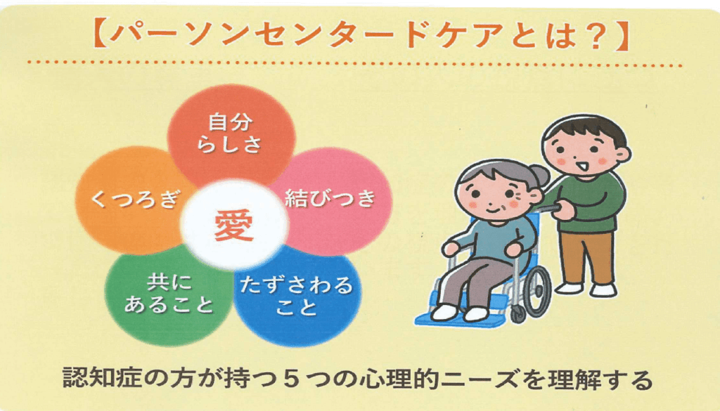 パーソンセンタードケアとは、認知症をもつ人を一人の【人】として尊重し、その人の立場に立って考え、ケアを行おうとする認知症ケアの考え方です。